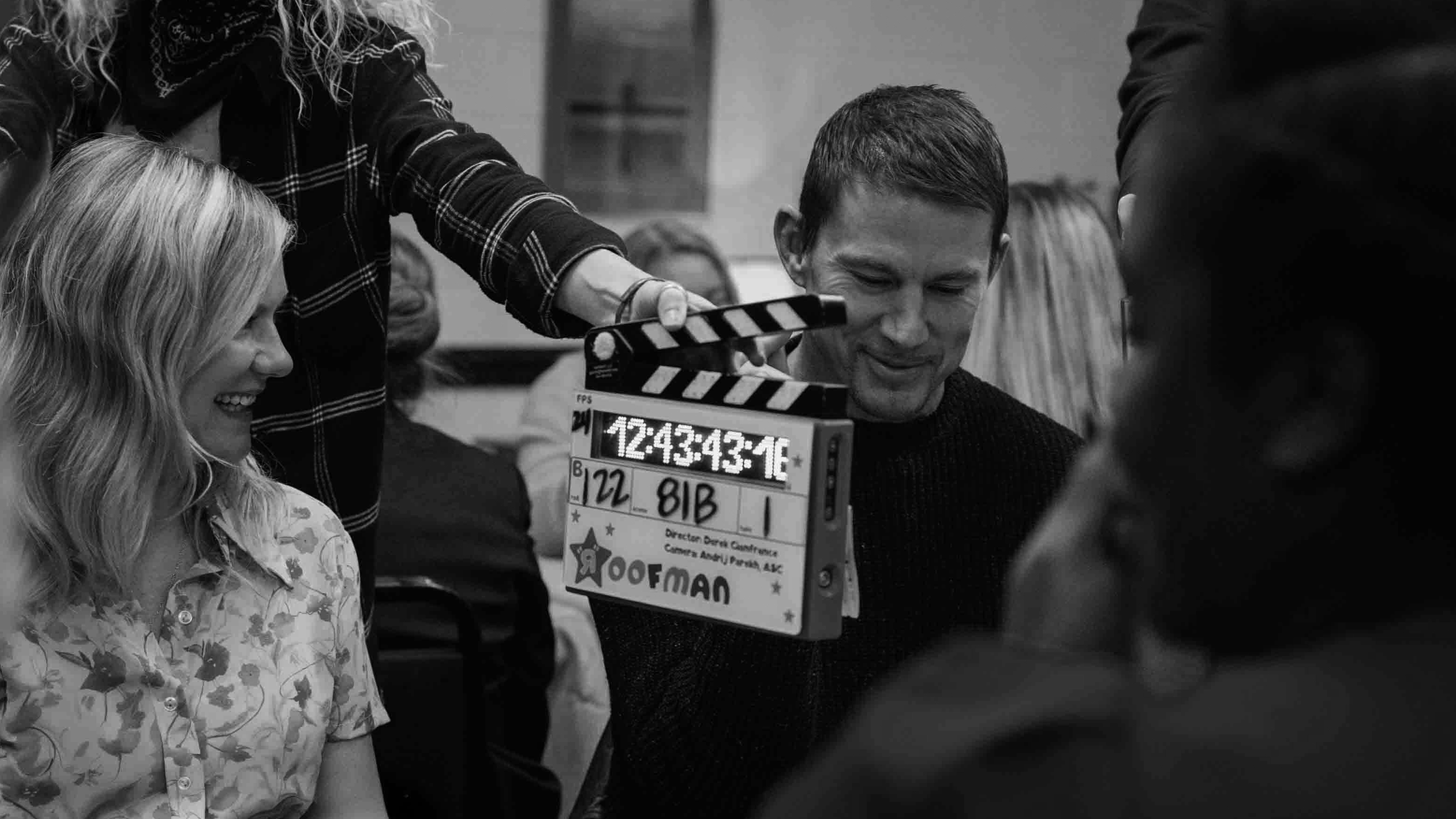Actors Kirsten Dunst (Leigh Wainscott) and Channing Tatum (Jeffrey Manchester) on set during production of Roofman (2025).