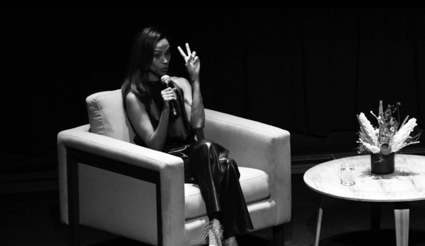 Zoe Saldaña appears to be giving a cheeky peace symbol but is describing how ‘subtitles are sometimes uncomfortable to watch..’ in her foreign language films. Representing the Canadian premiere of Emilia Pérez (2024) at the 49th Toronto International Film Festival (TIFF) in Toronto, Canada (September 5th – 15th, 2024), this conversation needed to happen.